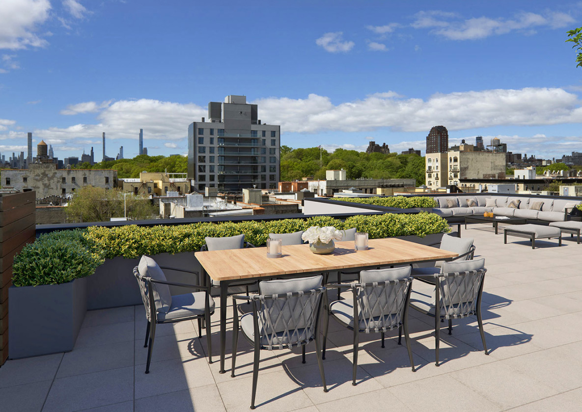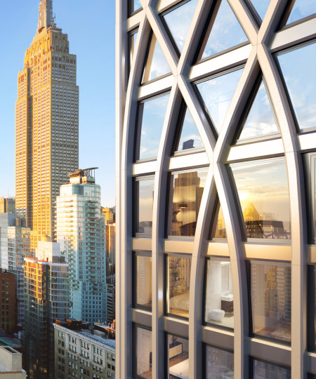 Sweeping views of Midtown and Downtown Manhattan, enhanced by Morris Adjmi’s spectacular latticed façade, bring the city into your home.