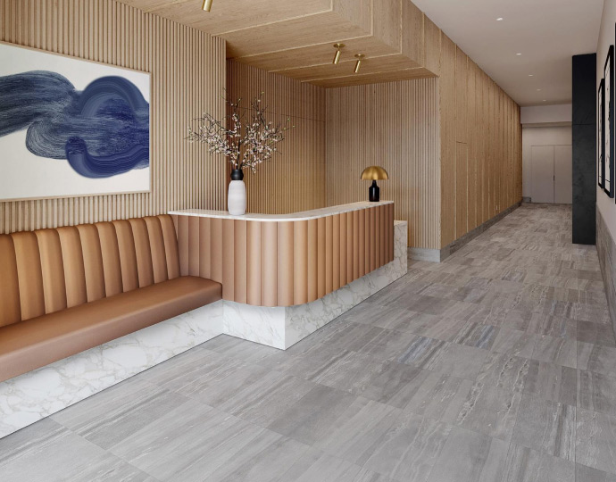 The lobby is an interplay of bold, natural materials